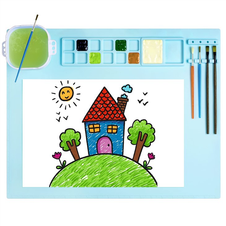 3. Тази актуализирана силиконова постелка за изкуство разполага с две големи кръгли тави за боя за ефективно смесване, сгъваема чаша за почистване на четка и възможност да се използва като палитра за боя и палет. Тази силиконова постелка за творци има люспи отляво и отдолу, които са по-практични за вашата артистична продукция.